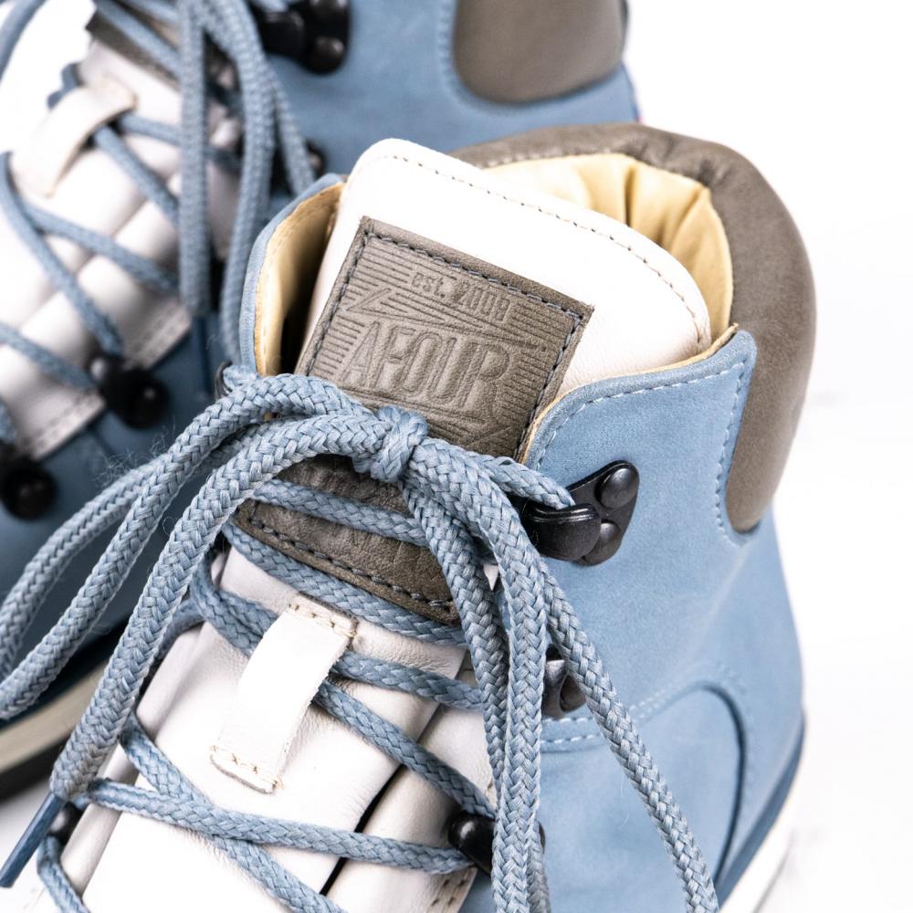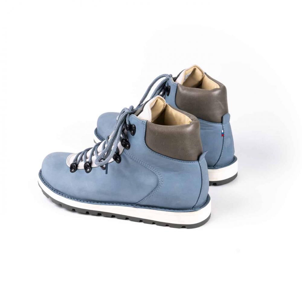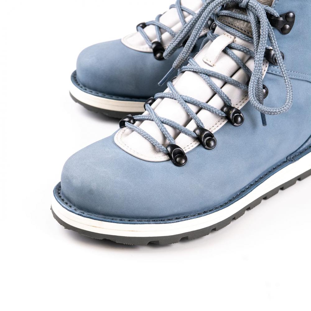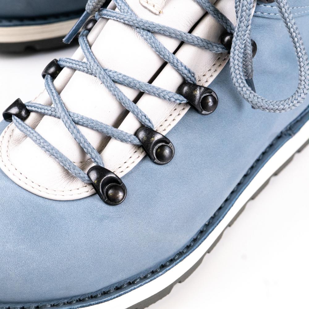 Расцветка Arctic - выполнена из нубука небесно-голубого цвета со вставками из замши молочного цвета. Металлическая фурнитура выполнена в цвете темный никель.