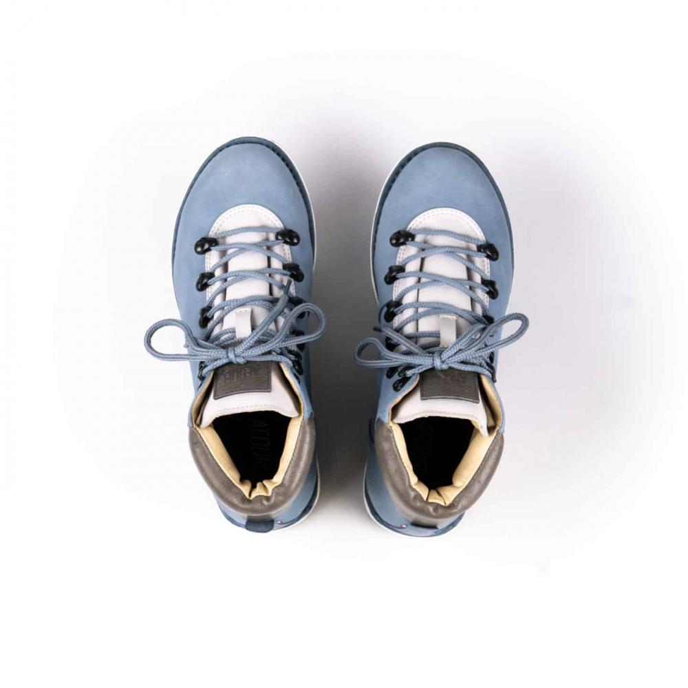 Расцветка Arctic - выполнена из нубука небесно-голубого цвета со вставками из замши молочного цвета. Металлическая фурнитура выполнена в цвете темный никель.