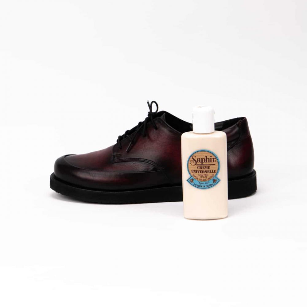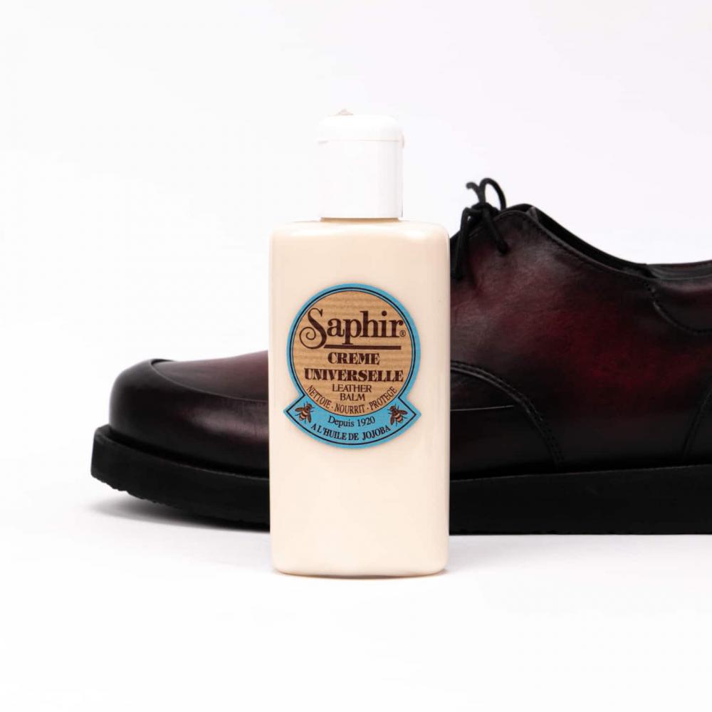 Один из самых лучших средств для деликатной чистки обуви. Формула этого бальзама была создана в 1920 году и оказалась настолько удачной, что до сегодняшнего дня не менялась. Бальзам-молочко подходит для приведения в порядок обуви и других изделий из гладких и лакированных кож, а также для изделий из кожи рептилий. В основе бальзама Saphir Creme Universelle большое количество пчелиного воска (28,9%) и масло норки, что делает это средство универсальным для ухода за изделиями из деликатных кож (овчина, баранья кожа, телячья кожа, шевро).